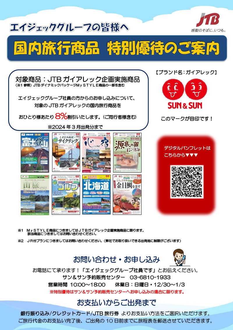お電話にて承ります!「エイジェックグループ社員です」とお伝えください。 ※社員確認の為、所属拠点や社員番号をお聞きする場合がございます。 株式会社JTBガイアレック サン&サン予約販売センター 03-5950-0303 営業時間 10:00~18:00 休業日:日曜日・12/30~1/3 ※特別優待はサン&サン予約販売センターへお申し込みの場合に限ります。 |